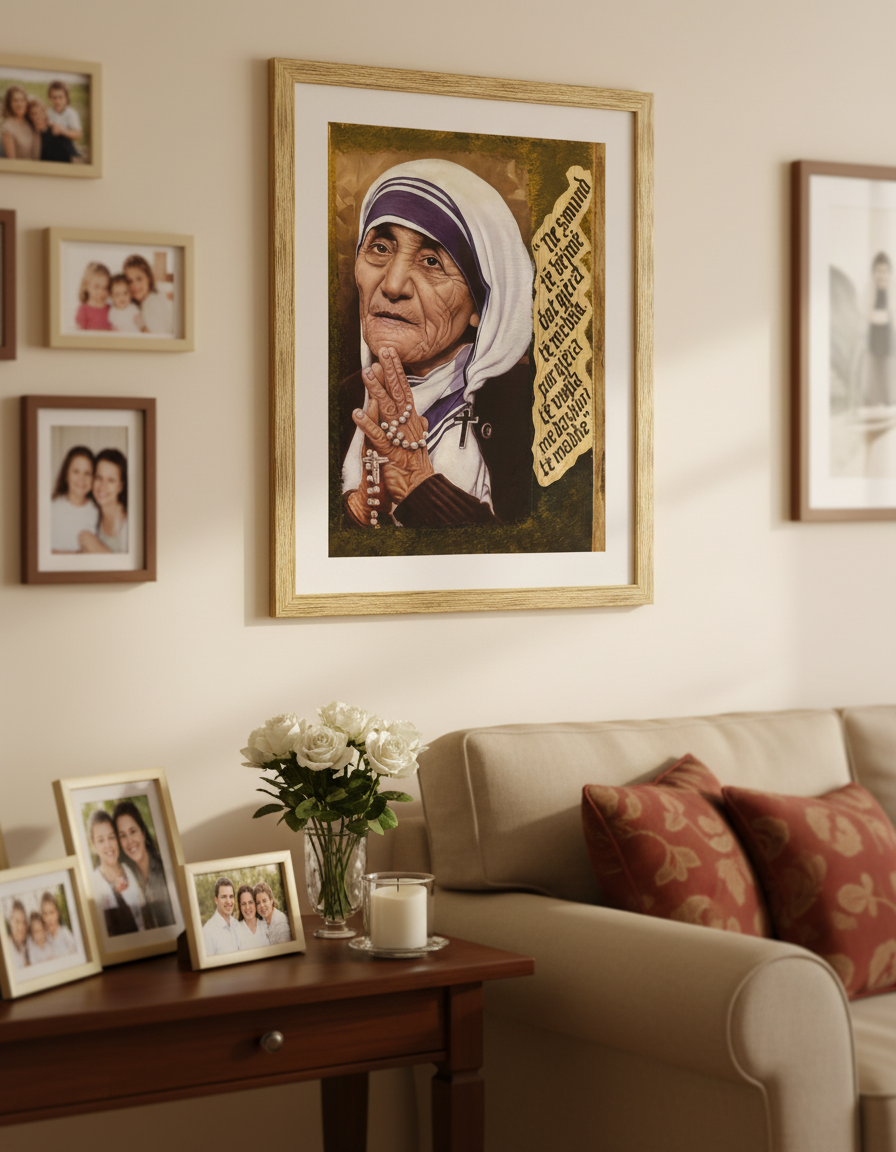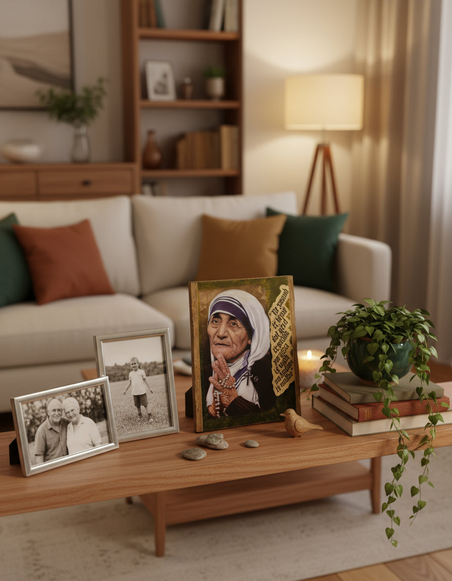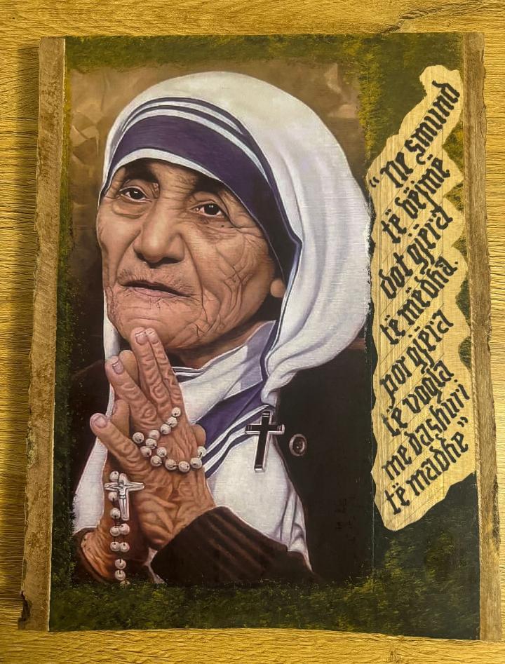 Një punim i ngrohtë dhe frymëzues që sjell figurën e Nënë Terezës të punuar në dru me detaje të mrekullueshme.